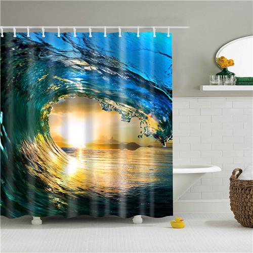 Ett Duschdraperi med solig havsvåg motiv som inspirerar