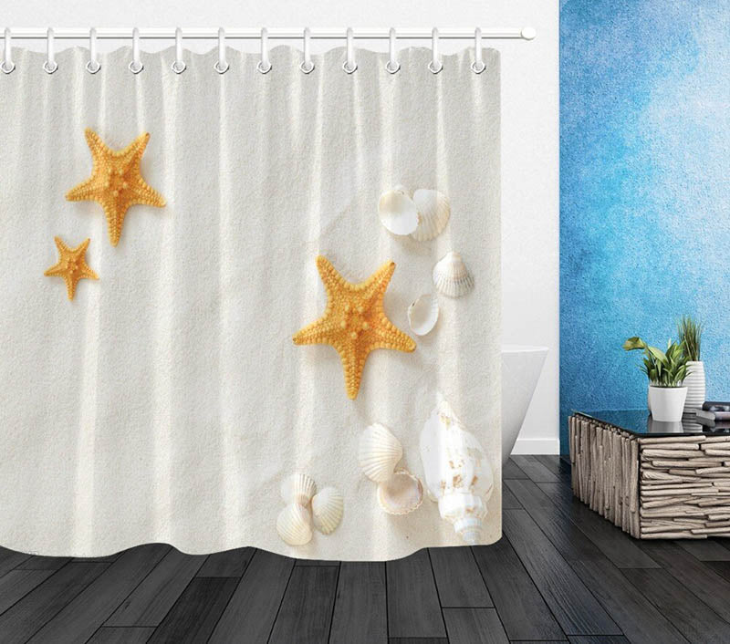 Vårt duschdraperi med vita snäckor och sjöstjärnor är mer än bara en inredningsdetalj; det är din dagliga dos av lugn och harmoni. Tänk dig att starta morgonen med en fräsch dusch omgiven av den vackra stranddesignen. Den livliga bilden av sjöstjärnor och snäckor på en sandfärgad bakgrund skapar en känsla av att vara vid havet, även när du är hemma. Det är perfekt för dig som älskar havet och vill ta med den avkopplande känslan in i ditt badrum. Glöm generiska duschdraperier – välj ett som verkligen speglar din personlighet och stil!