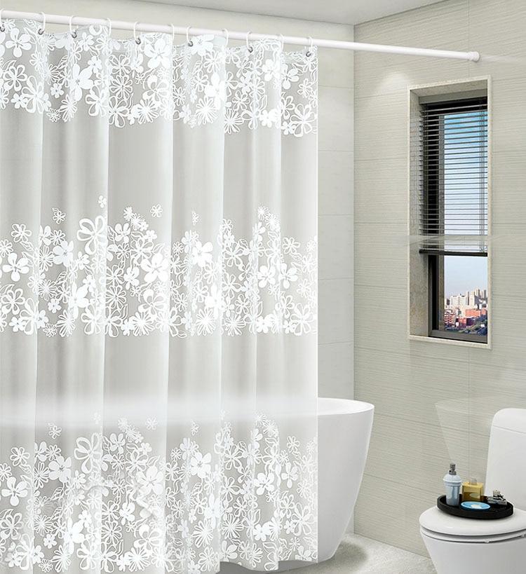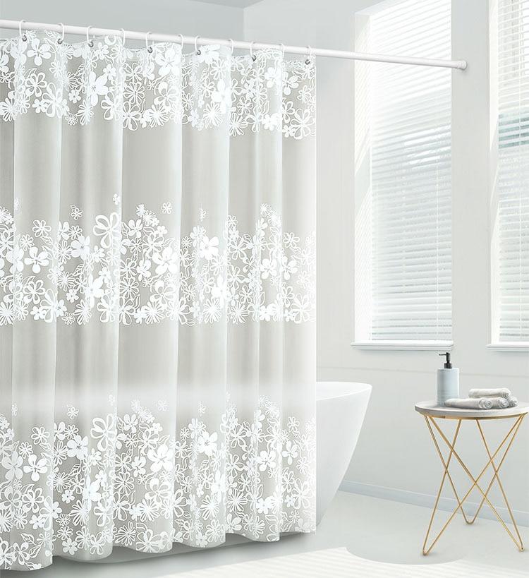 Förnya ditt badrum med ett halvtransparent duschdraperi med vita blommor